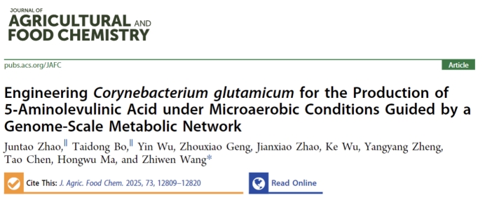 /天津大学王智文团队在农业和食品化学领域期刊《Journal of Agriculture and Food Chemistry》(一区TOP,2024 IF:5.7)上发表封面论文,基于基因组尺度网络模型模拟分析了不同溶氧条件下谷氨酸棒杆菌合成5-ALA的最优代谢通量分布,结合代谢工程首次实现了谷氨酸棒杆菌微好氧条件下5-ALA的生物合成。