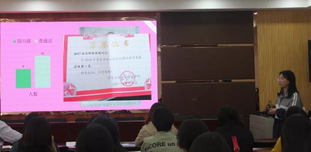 各班汇报人分别从班级建设、党团建设、学风建设、公寓建设及安全管理等方面对本班情况进行了全面汇报。2016级生物科学(教师教育)1班在班级建设及学风建设方面取得了优秀的成绩,获得校级优秀班集体及校级活力团支部,并实现了零挂课。2016级生物科学(教师教育)2班有多人参加互联网+及挑战杯等多项创业创新项目,并且在公寓建设取得31次评优,零差评,零拒检的优秀成绩。其他班级,有的成立学习小组,实现了互相帮扶的学习计划;有的团建工作形式多样,内容丰富,多次开展主题团日活动。每个班级都有自己的班级特色,他们在汇报成果的同时也提出了问题所在并制定了解决方案。