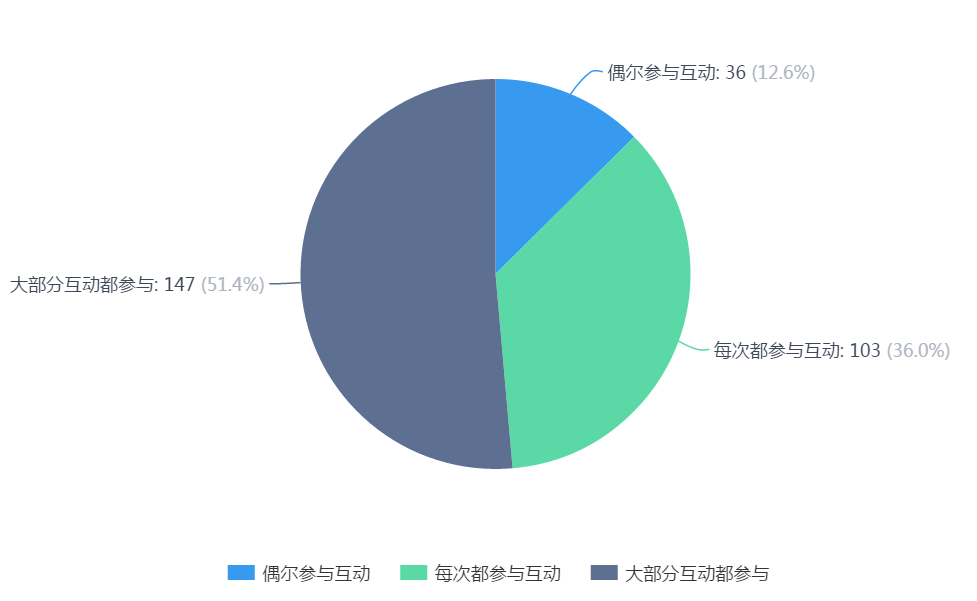 6.学生参与在线学习互动频率:每次都参与的互动学生占 36.0%,大部分互动都参与的学生占51.4%,偶尔参与互动的学生占12.6%。