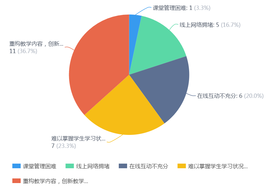 9.对于线上教学您面临的最大压力是:重构教学内容,创新教学设计占36.7%,难以掌握学生学习状况占23.3%,在线互动不充分占20.0%,线上网络拥堵占16.7%,课堂管理困难,也是对老师造成较大挑战的因素之一。