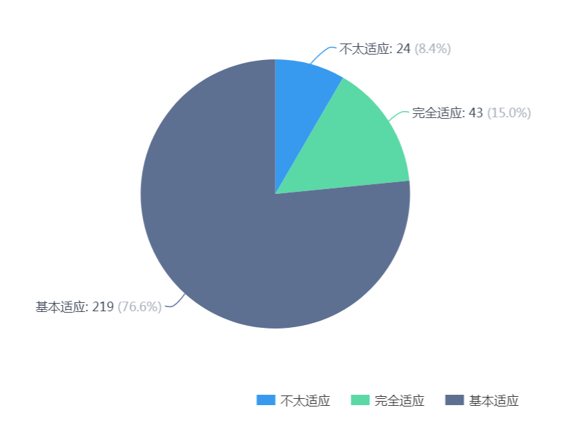1. 经过三周的在线学习,学生的适应程度:学生完全适应15.0%,基本适应 76.6%,不太适应 8.4%。