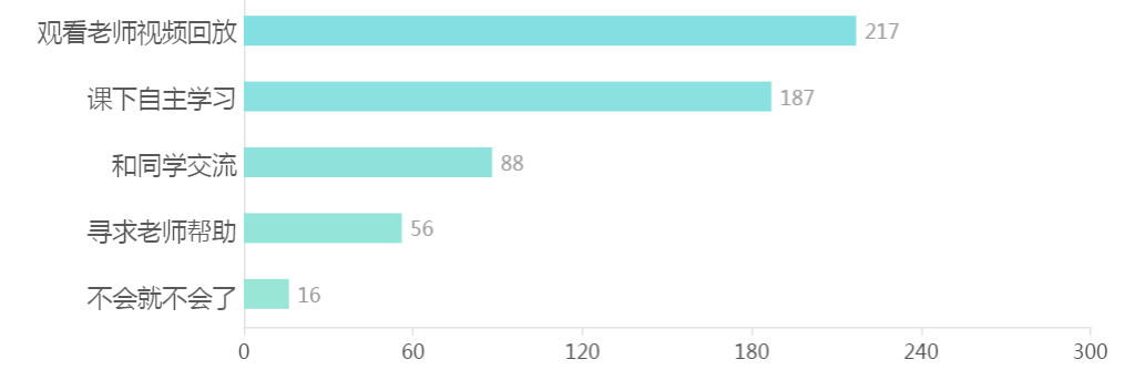 3.对于未掌握的学习内容,学生通常采取的学习方式是:观看老师录制视频217人次,课下自主学习187人次,与同学交流及寻求老师帮助分别为88人次和56人次。