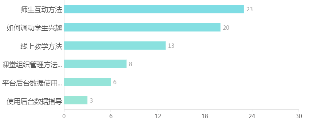 6.老师最希望获得的在线课程指导的方面有:师生互动方法,如何调动学生兴趣及线上教学方法等。