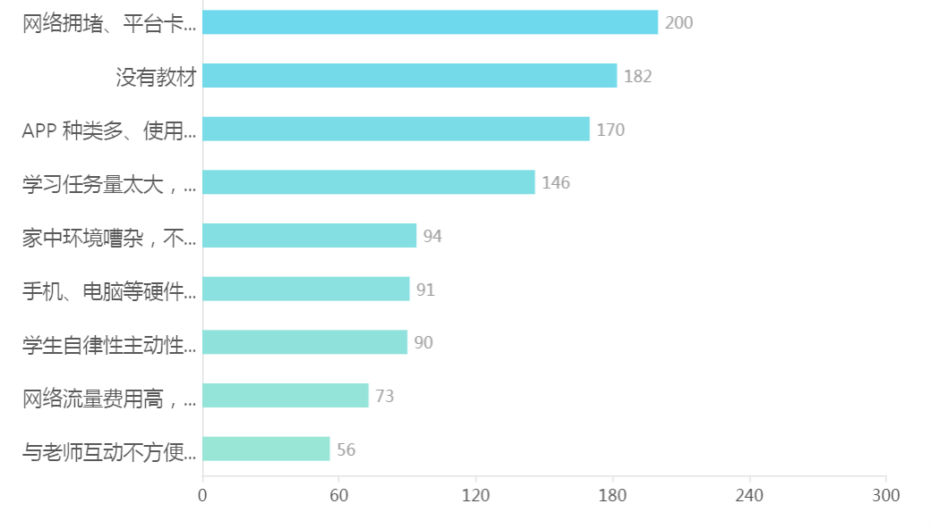 10.学生的学习压力主要因素:网络拥堵、平台卡顿、时常掉线影响学习为首要因素,没有教材排第二,APP种类多、使用不方便为第三影响因素,学习任务量太大,影响学习效果和家中环境嘈杂不方便学习分别列第四和第五。