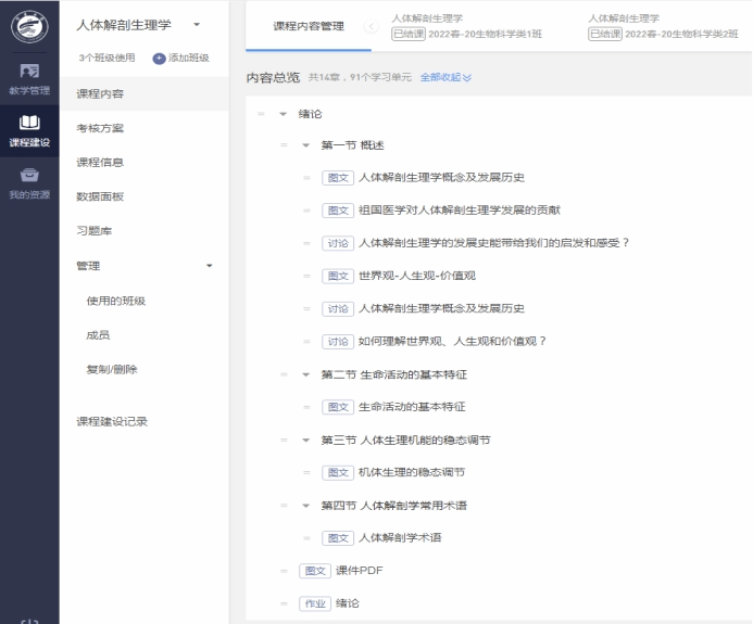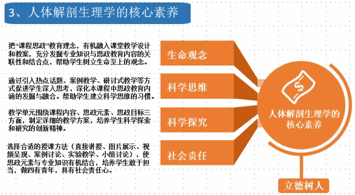 《人体解剖生理学》是生命科学中最重要的基础学科之一,是生物科学专业的专业核心课程。人体解剖生理学是研究人体各部正常形态结构和生命活动规律的科学,包括人体解剖学和生理学两部分内容。本课程重点内容是围绕人体结构和生理机制两条主线,从分子、细胞、组织、器官和系统水平上介绍人体正常结构和功能,为从事生物科学及相关领域的教育、科研、技术研发等工作,奠定扎实的专业基础知识和基本技能。人体解剖生理学以立德树人为基本原则,结合“健康中国2030”规划纲要,不断强化学生的科学素养、创新意识、人文情怀,实现“知识传授、能力提升和价值引领”的教育目的。