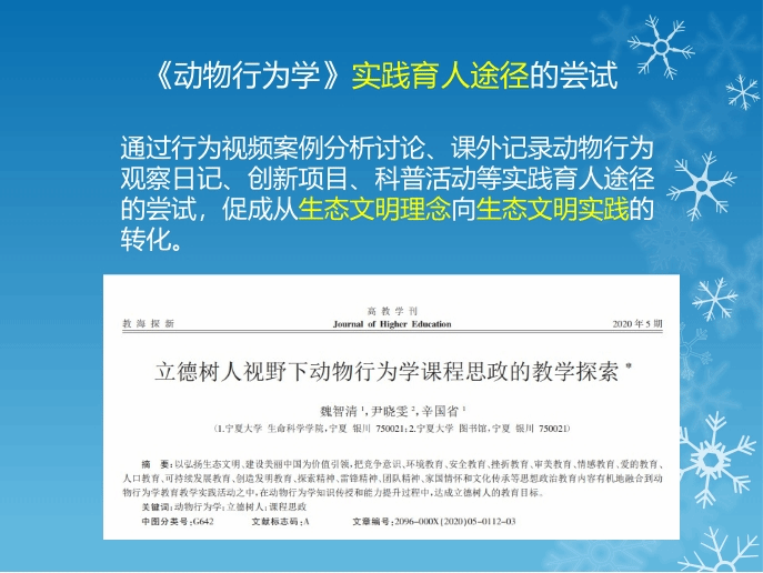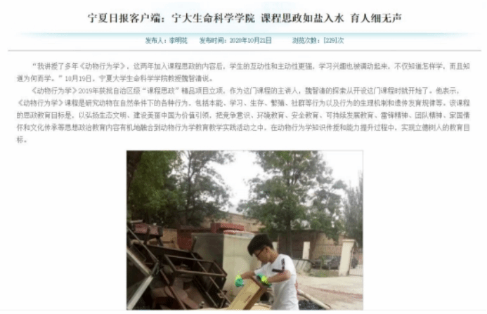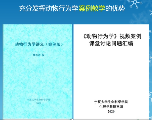 书记沈岩东为课程共建人,负责把关课程思政与思政课程同向同行。杨贵军教授负责行为案例选编。杨涓教授负责行为生态学、保护行为学案例选编。赵红雪教授负责思政元素梳理。张东涛教授负责解释行为的生理机制。