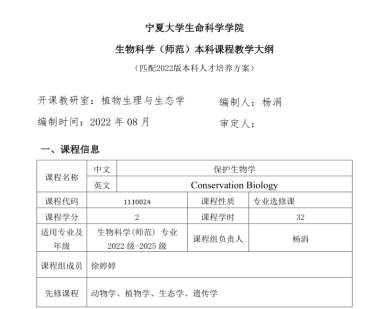 《保护生物学》是面向生物科学专业(教师教育方向)、生物科学专业学生开设的自然科学生物类专业课程。也可作为通识教育选修课面向全体学生开设。《保护生物学》是从保护生物及其环境的角度出发来保护生物多样性的科学,是研究生态危机起因及预防机制的具有价值取向的关于生物多样性保护的公共科学,聚焦于珍稀濒危物种、栖息地、生态系统等多层次的研究和保护,是基础科学与应用科学的综合,也是自然科学与社会科学的交叉学科。而生物多样性是人类社会赖以生存的基础资源和自然财富,也是生态文明水平的重要标志。国家明确提出了尊重自然、顺应自然、保护自然的生态文明理念,并实施重大生态修复工程,增加生态产品生产能力,保护生物多样性。